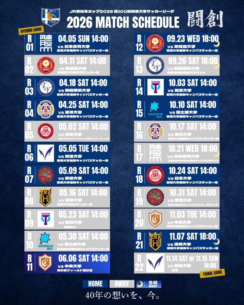 JR東日本カップ2026 第100回関東大学サッカーリーグ戦 試合日程が公開されました。